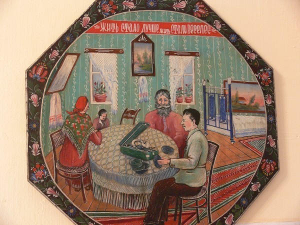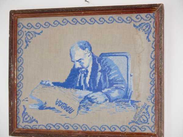 В городе до сих пор помнят Ильича. В скверике стоит скромный, никому не мешающий Ленин. Владимир Ильич. Ну, пусть он и здесь не мешает. Имеются также предметы рукоделия с изображением главных вех в развитии канувшего в лету рабоче-крестьянского государства.