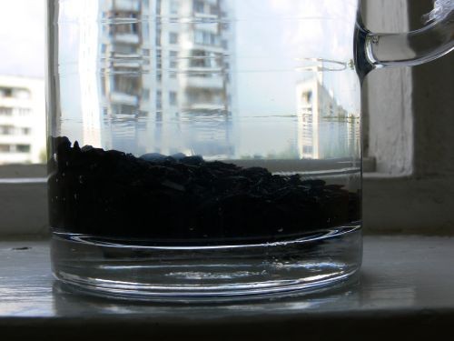 Вот вода московская после японского микрофиброфильтра, отстоенная на шунгите в течение примерно 6 часов. Там явно видна некая интерфаза, локализованная полосой над чёренькой каменной крошкой.