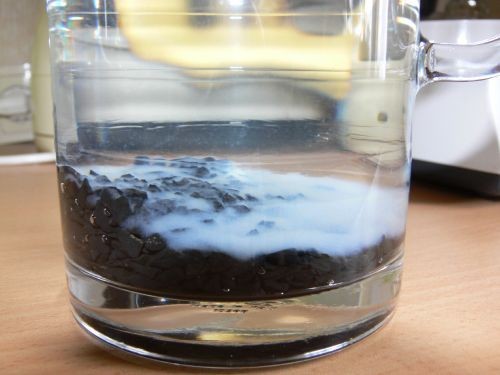 А вот это - тот же сосуд с той же водой, простоявшей ночь. Интерфазы нету. Зато есть богатый осадок на шунгите. Что там в осадке - мне неведомо. Может кто скажет?...